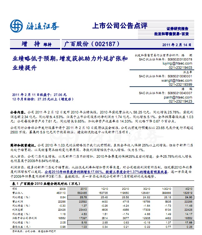- ·廣百股份(002187)一季報點評:業績符合預期,省內持續擴 2011-4-21