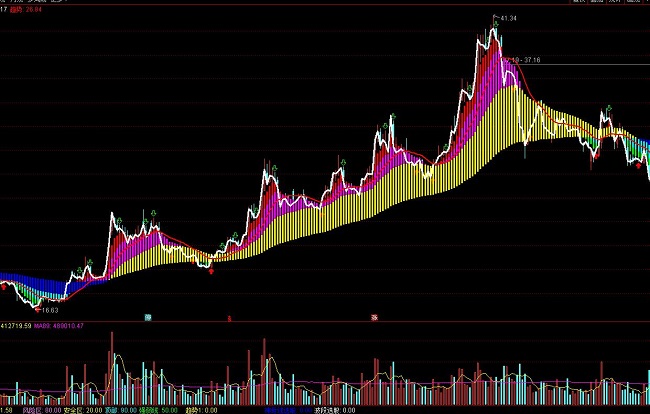 中牛:STICKLINE((MA10>強弱),MA10,強弱,1,0),COLORMAGENTA;